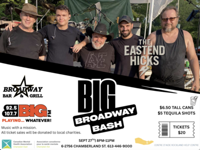 Musique offerte par «The Eastend Hicks», le samedi 27 septembre de 20h-23h au Broadway Bar & Grill. Les billets sont disponibles à Broadway Bar & Grill à $20.00 chq